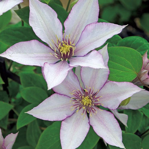 紫の覆輪が美しい大輪花。花芯の黄色とのコントラストが印象的で、全体的にシャープな印象を持たせる。花付きの良い多花性品種。キンポウゲ科