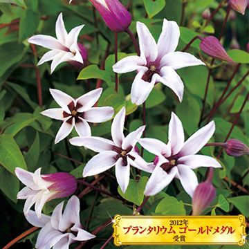 エレガントなチューリップ咲きで、赤紫の蕾が開くと花弁内側は白の非常に魅力的な花色。とても花つきよく、強健で育てやすい。キンポウゲ科
