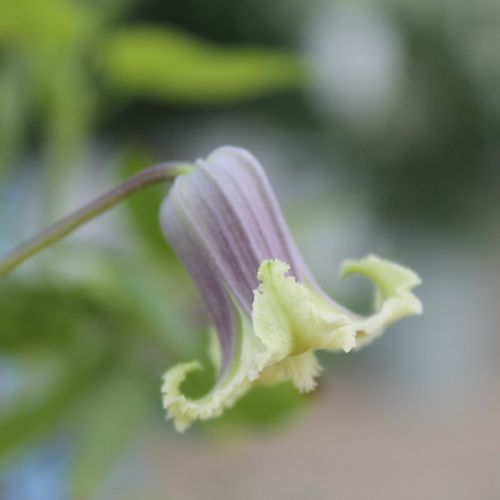 うどん粉病に比較的強い藤紫色の壷型クレマチスで、フリルがかってカールした花姿が特徴的。カールした弁先の咲き始めはライムグリーンで、咲き終わりの頃にはクリームに変化する。柑橘に近いような香りが少々あるが好みの分かれるところ。開花時期が遅く、3m近く伸びてから咲くのでフェンスやアーチ向け。他のヴィオルナ系と比べて難易度が高いので中級者以上の方にオススメしたい。キンポウゲ科