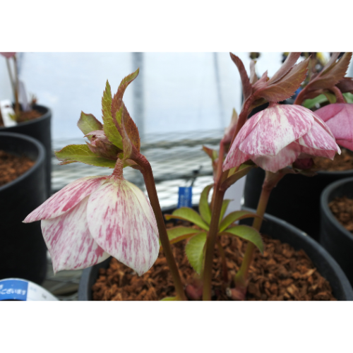 白の花びらにピンク色の絞り模様が入ったセミダブルの花。 和のテイストを感じられるとても特徴的なクリスマスローズ。秋~翌春は日向で、夏は半日陰で管理する。キンポウゲ科
