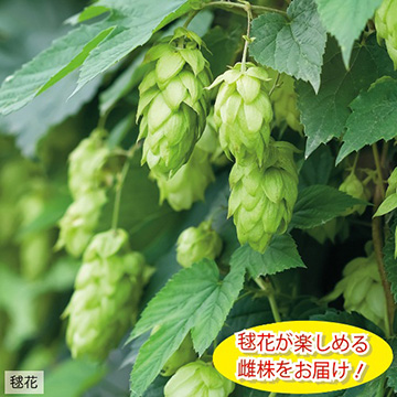 ビールの原料として有名なつる性植物。生育旺盛で、10mほど伸びることもある。毬花が完全に熟す前に摘み取り、天ぷらやハーブティーなどで独特のほろ苦さを楽しむ。高温多湿に弱いため、風通しのよい場所で管理する。アサ科