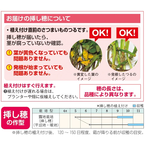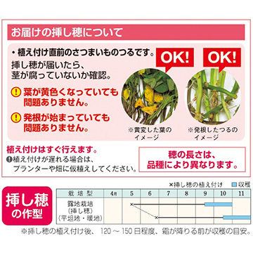 ●サツマイモの挿し穂の納期はその年の気候によって変動する場合があります。そのため、ご注文納期にお届けできず、後送となる場合があります。