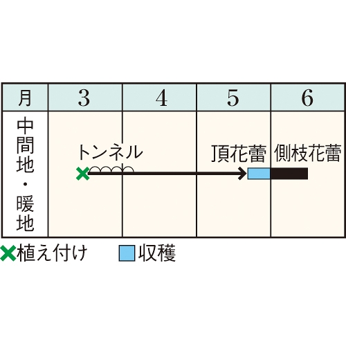 - 花期、収穫期(○○どり)、高さ、収穫重量などの性質は、一般平坦地における適期栽培でのおおよその目安です。