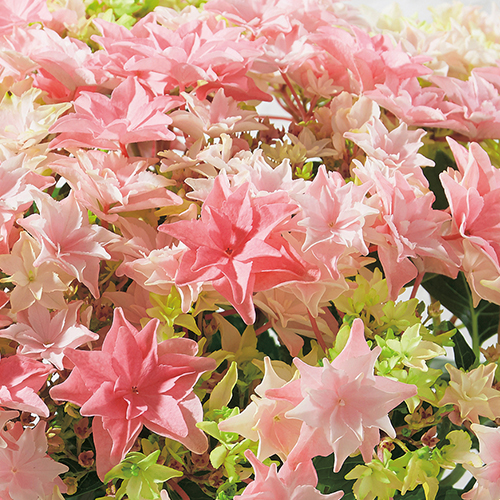 佐賀県の生産団体、佐賀県あじさい研究会で生産されている品種。こちらの産地ではシャープに整った花形のアジサイが生み出される。満開時は株上を花が覆うように咲く。