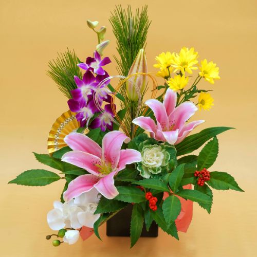 ■花材:若松、千両、オリエンタルリリー(桃)、デンファレ(赤紫)、スプレーマム(黄)、ハボタン(白)、胡蝶蘭(造花)