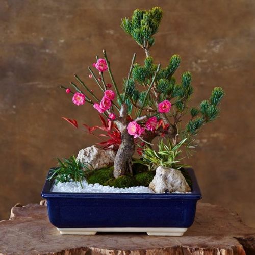 お正月らしく縁起のよい植物を利用した箱庭のような盆栽。