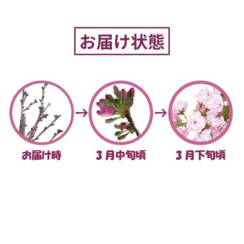 新年にふさわしいサクラの盆栽。蕾の状態でお届けするため、美しく花が開く様子を楽しめる。