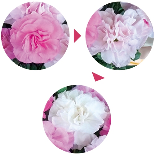 母の日定番カーネーションのフラワーギフト。ピンクから白色に近い淡いピンクに花色が変化するのが特長の品種。ナデシコ科
