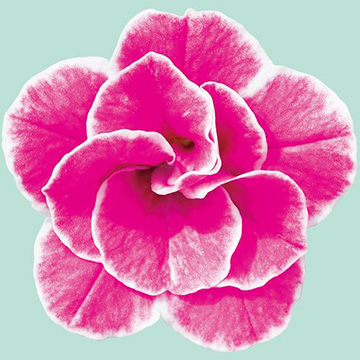 生育旺盛で花つきよく、暑さや病気に強い。真夏でも一重になりにくく、長期間美しく咲き続く。ピンク地に白覆輪の入る花色で、花弁をレースで縁取りしたような花姿が上品で愛らしい。ナス科