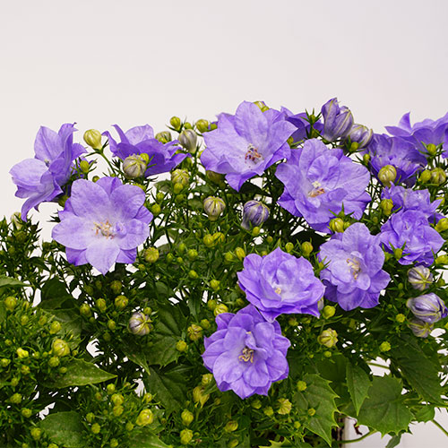 大輪八重咲きの青花品種。分岐力が高く、こんもりとした草姿に数えきれないほどの花を咲かせる。夏場は直射日光を避け、雨の当たらない軒下などの風通しのよい環境で管理すると夏越ししやすくなる。花柄を付けたままにすると病気や蒸れが発生しやすくなるため、こまめに取り除くとよい。花径約3.5cm。キキョウ科