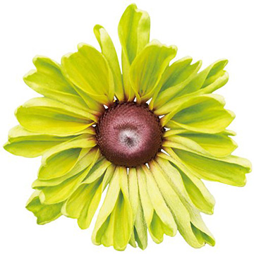 グリーンがかった黄色い花弁と赤茶色の花芯とのコントラストが魅力的。キク科