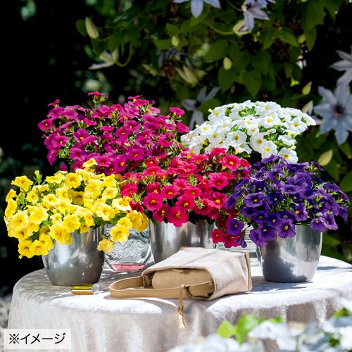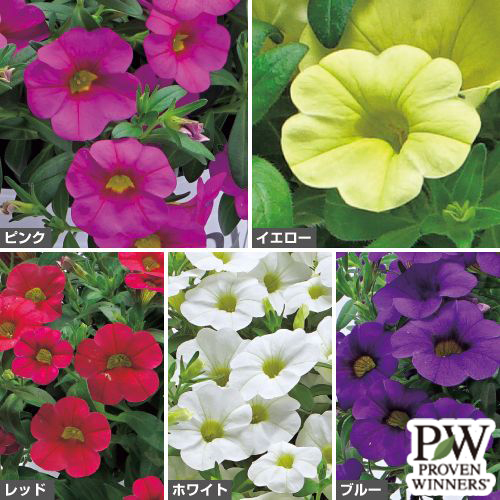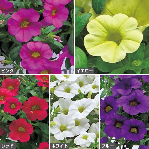 コンパクトだが根が強く、小鉢でも長く咲き楽しめるシリーズ。ビビッドな花色バリエーションをセットでお届け。ナス科