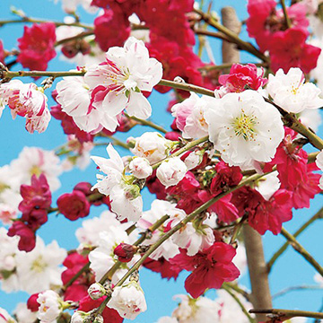 花桃の中でも人気の品種で紅白の咲き分けや絞り咲きなど、多彩な花色が競い合うように咲く。桃の節句に欠かせない縁起木として、切り枝でも重宝する。バラ科