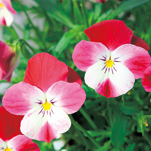 濃淡あるローズ色とホワイトの明るい色調で、冬花壇を華やかに彩る。花径約3.5cm。スミレ科