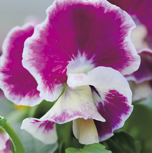 上弁がパープル系、下弁がホワイトの花色。ダンサーの衣装がひるがえるように咲く優雅な花弁が楽しめる。花径4~5cm。スミレ科