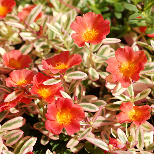 日照や肥料によって葉や花の色が変化する斑入りのポーチュラカ。夏の暑さや乾燥に強く、真夏も休まずに咲き続ける。枝は地を這うように伸びる。スベリヒユ科