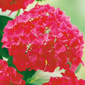 鮮紅色の小輪てまり咲き西洋アジサイ。樹高約50cmの矮性種で、鉢植えに好適。用土はアルカリ性を保つとよく発色する。アジサイ科