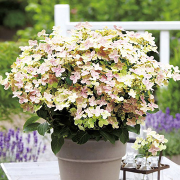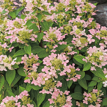 ノリウツギの中で最も早く開花するといわれ、ガクアジサイのような咲き方をする多花性種。白から、徐々にピンクに色づく花が魅力的。鉢植えや狭い場所での植栽におすすめ。アジサイ科