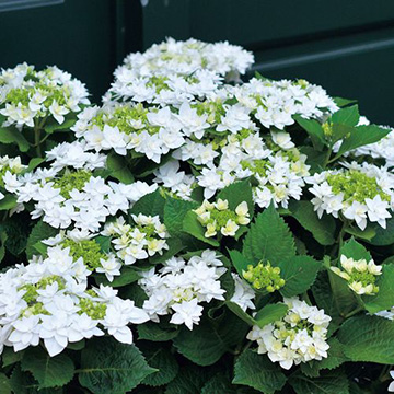 密集した純白、剣弁八重咲品種。純白から緑への変化も美しい。アジサイ科