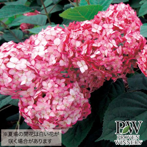 「ピンクのアナベル」改良種。明ルビー色で中心は銀色を帯びたピンクとなる、濃淡グラデーションが美しい装飾花が魅力。樹高1m以下とコンパクトでベランダ栽培も楽しめる。アジサイ科