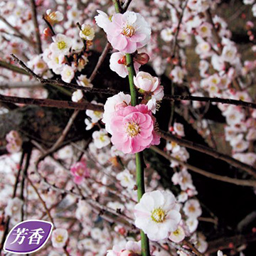 観賞用の梅で甘い香りが春の訪れを告げる。淡紅と白、紅、絞りなどを1本で咲き分ける魅力種。バラ科
