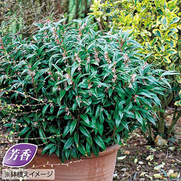 耐寒・耐陰性に優れ、日陰でもよく育つ。花壇の植栽、寄せ植えなど様々な用途に。濃紅色の蕾から、ハチミツのような甘い香りをもつ白花を咲かせる。分枝性がよく、光沢のある濃緑色葉が密につき美しいマウント状になる。秋には赤や黒に発色する実をつける。ツゲ科