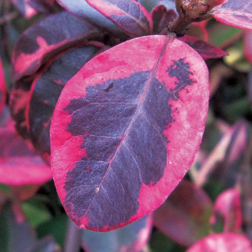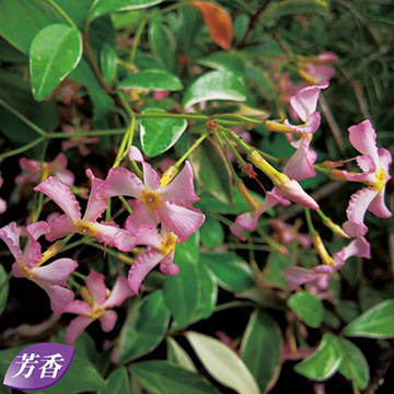 ジャスミンのような芳香がある風車形の可愛らしいピンク花を咲かせ、葉は鮮やかな白フクリン斑が入る。秋にフクリン斑のまま紅葉する姿も美しい。キョウチクトウ科