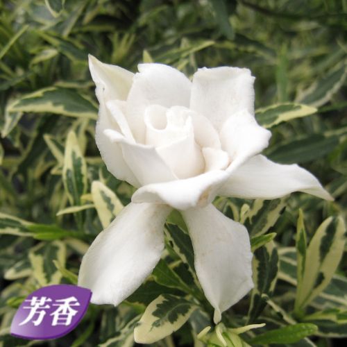姫クチナシの斑入り品種で花以外の時期も楽しめる。葉が細かく花も小さく可愛らしくコンパクトな樹形で鉢植えにもむく。クチナシならではの甘い香りと秋の実も楽しめる。アカネ科