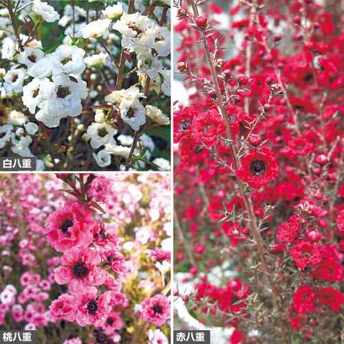 別名「ティーツリー」「マヌカ」。小さな葉を茂らせる常緑樹で、ウメに似た花を咲かせる。フトモモ科