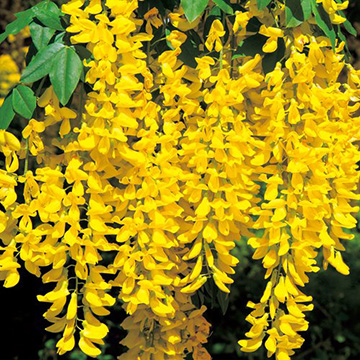 「金鎖」と表されるように連なり咲く鮮黄色花。満開時は樹冠を埋めつくすほど豪華に咲き、見応えがある。マメ科
