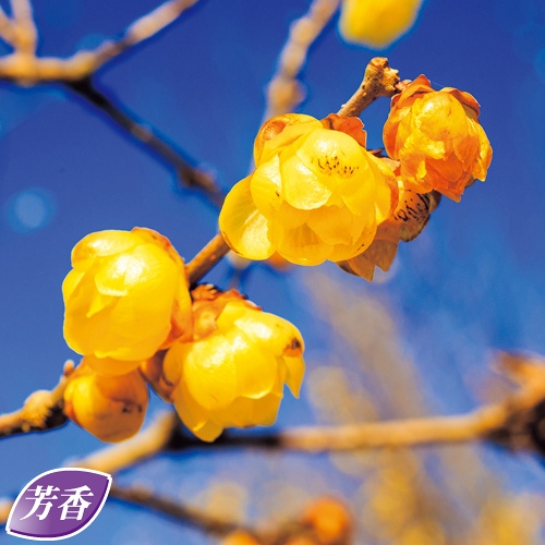 「素心ロウバイ」に比べ、花色は濃く鮮やかな黄色。ころんと丸い可憐な花を咲かせ、甘酸っぱい香りを漂わせる。直立性で生長も早く、庭や切り花で新春を彩る。ロウバイ科
