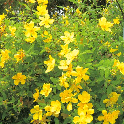 目を引く明るい黄金色花を多数咲かせる.花芽や蕾と共に見られるピンク色のがくも魅力的。紅葉も美しい。蜜源植物。オトギリソウ科