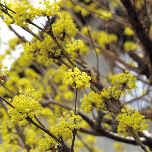 実付きよく早春の庭木で人気。展葉に先立ち枝いっぱいに鮮黄色の花をつける。秋は紅葉し、光沢のある赤い実を鈴なりにつける様子も楽しめる。ミズキ科
