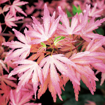 深い切れ込みが入るピンク地にライムグリーン色斑の葉が美しい。矮性種で成長がやや遅いため、鉢植えにも向く。ムクロジ科