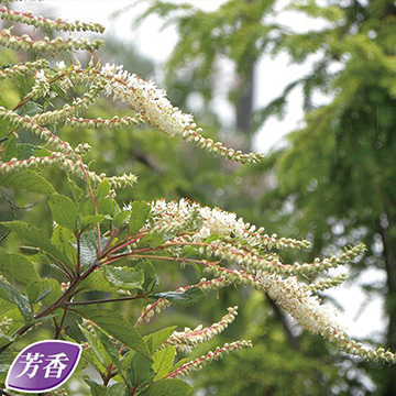夏に枝先にたくさんの穂状の花を咲かせる。生長しても管理しやすい高さでまとまり育てやすい。ほのかに甘く香る蜜源植物。リョウブ科
