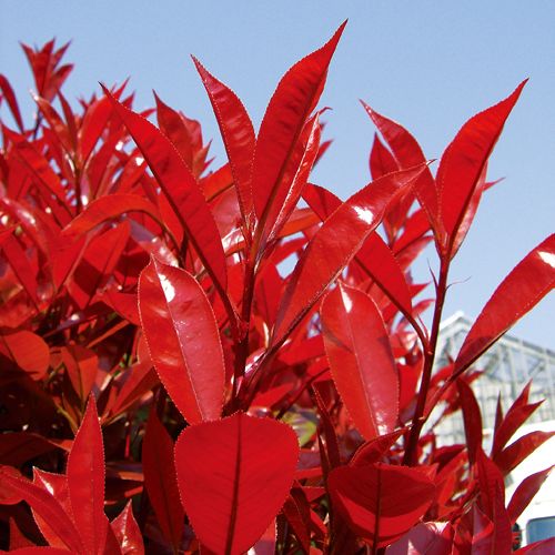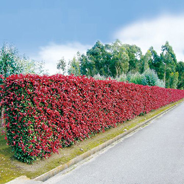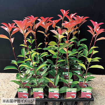 燃えるような深紅色の新葉が美しい、垣根用樹の定番種。本種は洋種ベニカナメの中から選抜された優良個体で、 6 月と 9 月の年 2 回刈り込みを行えば、一年中美しい葉色が楽しめる。バラ科