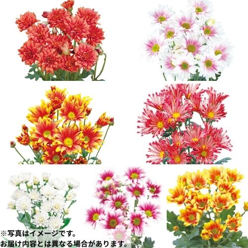 花径2~6cmの変わり菊ミックス。二度咲き菊の中から、二色咲きや八重咲きなどの変化に富んだ種類をお届け。キク科