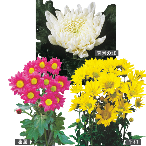 お盆のお供え用としてお使いいただける、色と大きさが複数入ったセット。キク科