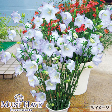 直立性の花茎に、パステル調のライトブルー覆輪花が涼やか。夏季は半日陰の風通しのよい所で育てるとよい。キキョウ科