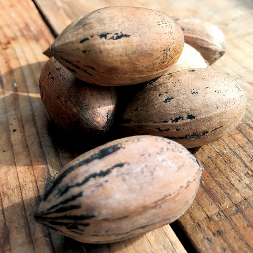 別名「ピーカンナッツ」。クルミに味は似ているが、殻がやわらかく、苦み少なく甘みがあり脂質が豊富で「バターの木」とも呼ばれる。外果皮の殻を取り除いて仁(ナッツ)を楽しむ。クルミ科