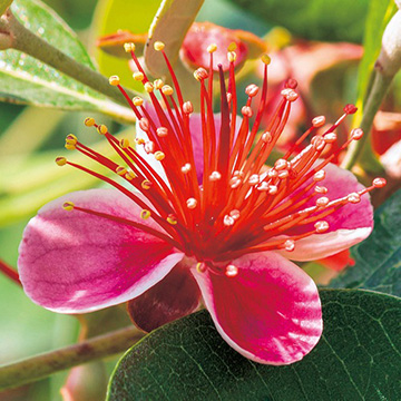 南米原産の「パイナップルグァバ」とも呼ばれる香り高い果物。収穫後に追熟させた果実はキウイとモモを合わせたような味で、ジューシーで甘酸っぱく生食やジャムにして食べる。花も甘く食用になる。フトモモ科