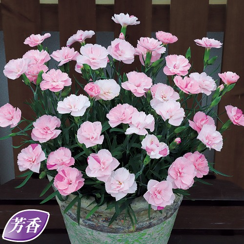 淡ピンクからパールピンクへと変化し、時に濃ピンク色が差す花色が美しい。年中甘い香りが楽しめる、耐病性、耐暑性が強く育てやすい。ナデシコ科