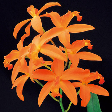 小柄な株から細長くしっかりとした花茎を伸ばし、色鮮やかなオレンジの中輪花。開花期は秋の終わりから冬の初め。株はコンパクトでバルブが密着して育つため場所も取らないミディカトレア。ラン科
