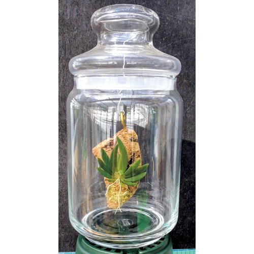 ガラス容器の中で観葉植物としてランを栽培し楽しむ、新しいスタイルのテラリウム。水ゴケを巻き付けたランを、ふたからテグスでつるしており、瓶のふたを開けない限り中の湿度で水やりの必要がない。風通しも関係ないので管理の手間は、ほぼ不要。