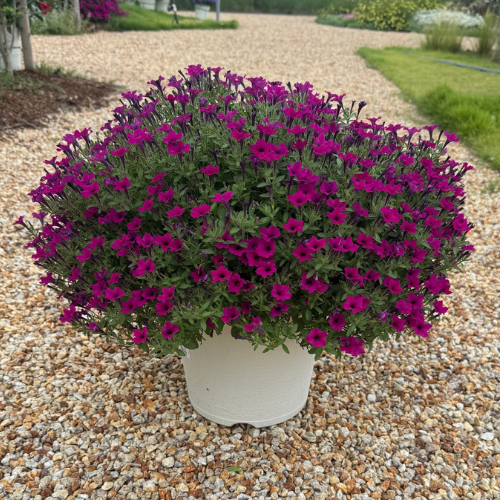 鮮やかな紫色の花弁。暑さにも強く花姿を変えずに咲き続ける、メンテナンスフリー。花径3㎝前後。ナス科