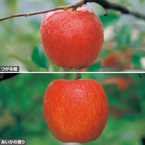 | 【商品情報】 | ■つがる姫® 「つがる」よりややしっかりした肉質で、糖度が高くおいしい。早生品種。 ■あいかの香り〈農水省登録品種〉 大実で蜜入りが非常に多く、食味がよい人気種。日もちもよい。 |