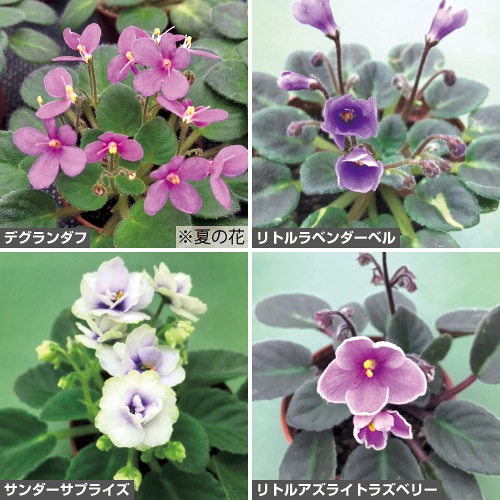 花形や花色、葉形などが多様なセントポーリア。今回はミニ種4種をセットにしてお届け。イワタバコ科