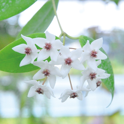 星形の白い花とさわやかな甘い香りがあり楽しめるホヤ。つるになりにくく、立ち性となるが長く伸びると倒れてくるので支柱などで支えるか適宜切り戻す。花が一度付いたら同じ部分に再度花が付くので花座は切らないようにする。キョウチクトウ科