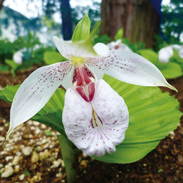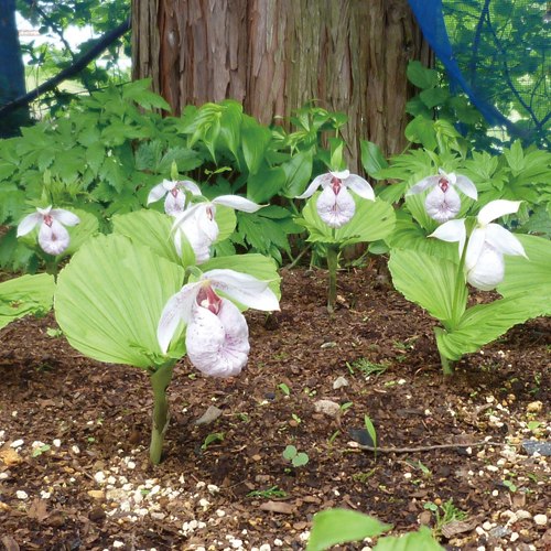 花は桃色の袋咲き。育てやすい宿根草だが、夏の強光を避け葉焼けしないように管理するとよい。ラン科