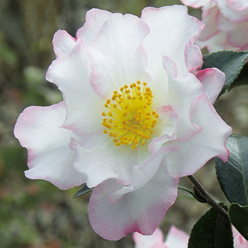 フリルのような花弁に淡桃色の縁取りの可愛らしい花。生長はゆっくりで手間があまりかからず多花性。ツバキ科